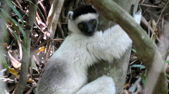 En piste pour dénicher les lémuriens blancs ! Après quelques petites foulées, en tournant la tête, allongé sur une branche, en voilà un ! Toute la famille apparaît progressivement ! Leur particularité ? Ils se déplacent sur deux pattes et de côté comme s’ils dansaient ! Nous restons un moment à les observer…